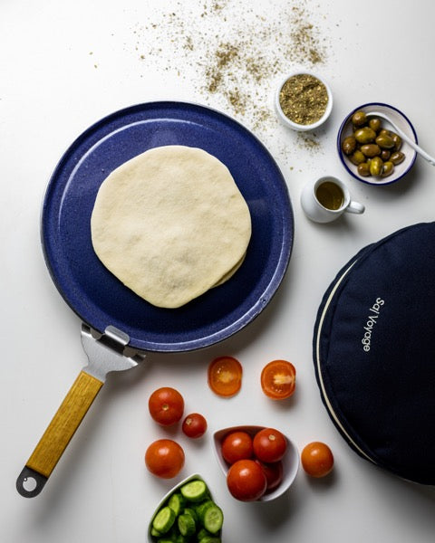 The versatile kit revolutionises your cooking experience.Every component in this kit is designed to serve multiple functions, showcasing its uniqueness.The traveling pouch cleverly transforms into a "tara," providing a cushioned surface to extend your dough effortlessly. The handle pulls double duty as a convenient spatula, making it easier to handle and flip your creations. And the Saj pan itself acts as a mini oven, allowing you to bake a variety of mouthwatering mouajanet to perfection. Discover the unparalleled versatility of Saj Voyage, where every element enhances your culinary journey.